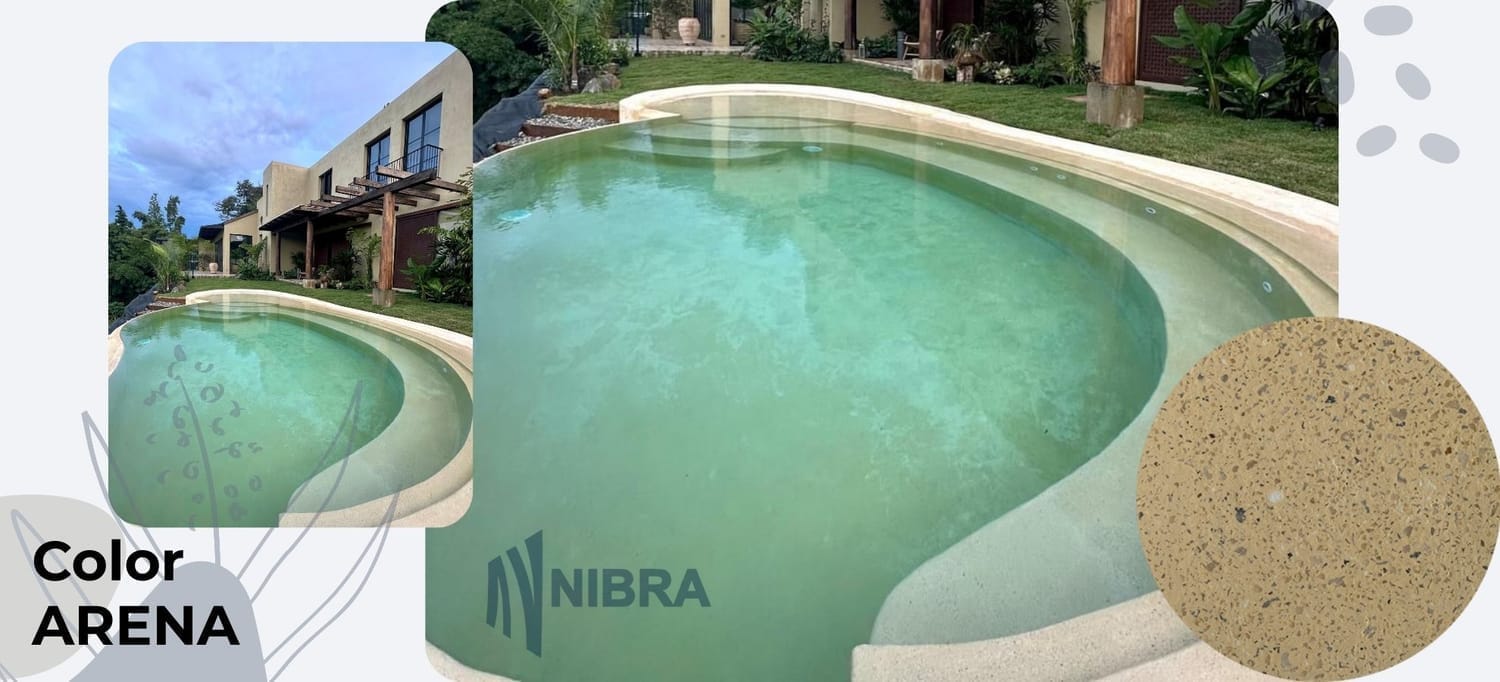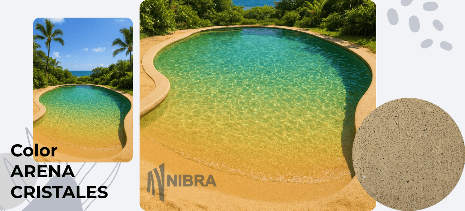 El color Arena Nibra transmite la calidez de las playas doradas y el lujo de lo natural. Bajo el agua, su tono claro produce reflejos suaves que hacen que el azul del cielo se mezcle con la claridad del fondo. Ideal para diseños mediterráneos o ambientes de inspiración resort, ofrece una sensación de amplitud, luz y pureza.