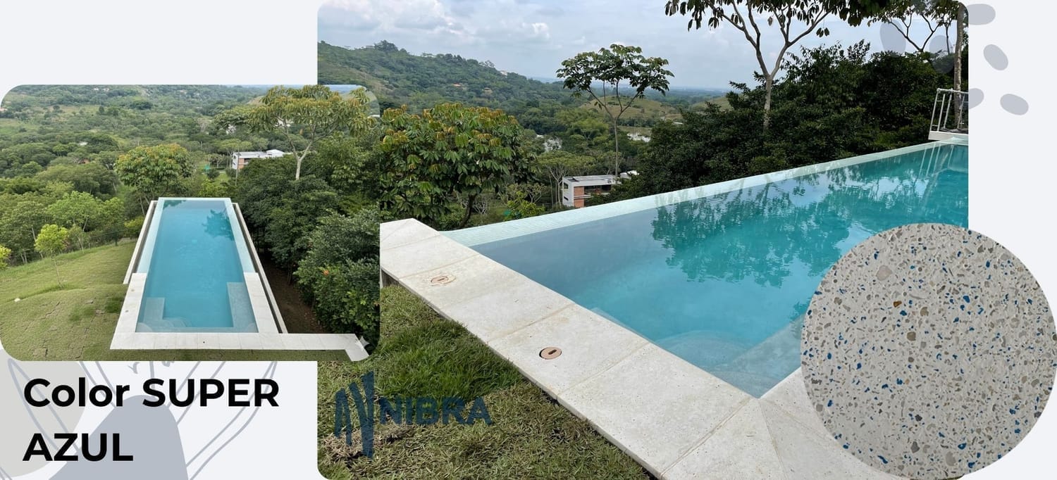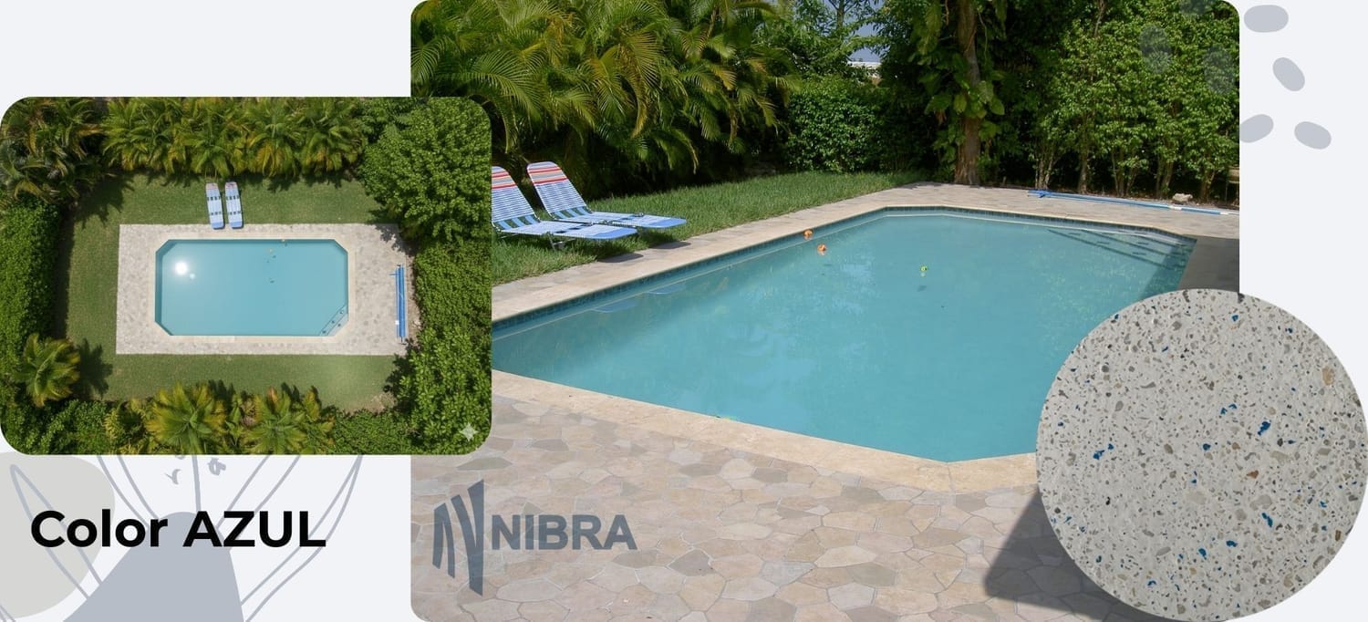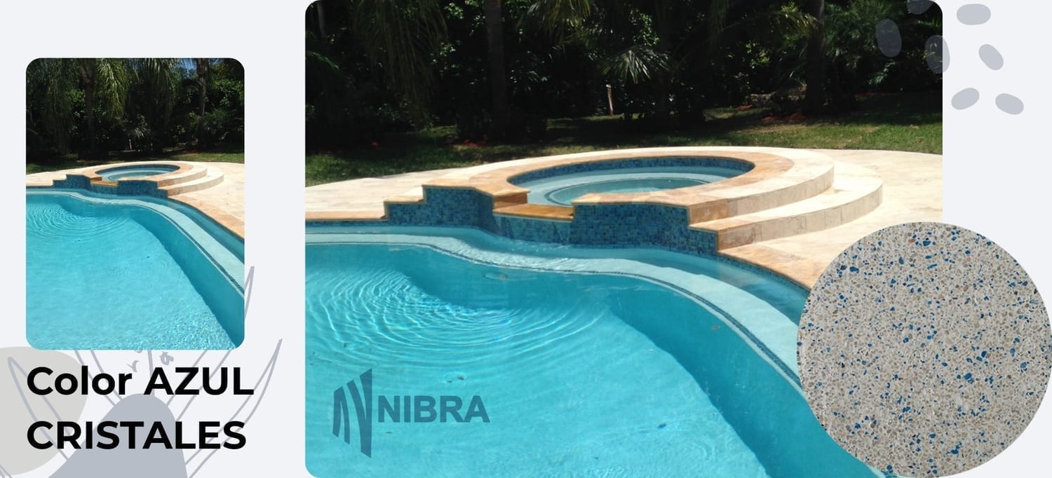 Profundo y sereno, el Azul Nibra transforma el agua en un espejo de calma y sofisticación. Su tono clásico evoca el azul de las piscinas tradicionales, pero con un brillo mineral que le da nueva vida. Ideal para proyectos que buscan elegancia que no pasa de moda y equilibrio visual, su superficie en cuarzo refleja la luz de manera natural, creando un ambiente de frescura y bienestar absoluto